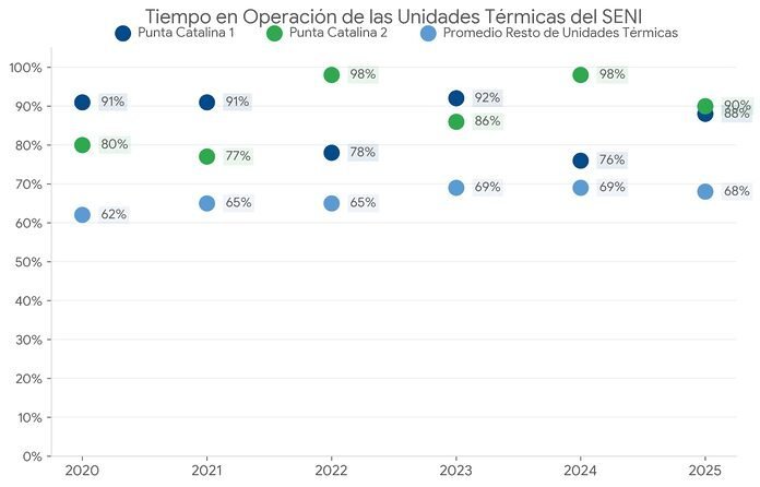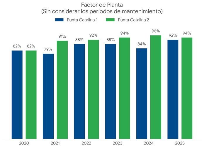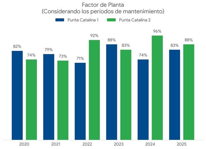 Un análisis comparativo del factor de planta de 2024 y 2025, que abarca más de 30 instalaciones generadoras del país, revela que Punta Catalina 2 alcanzó en 2024 un factor de 96%, el segundo valor más alto de todo el parque generador nacional, superado únicamente por Quisqueya 1. En 2025, ambas unidades mantuvieron factores de 83% y 88% respectivamente, mientras la mayoría de las plantas del sistema operó en rangos de entre 10% y 50%.
